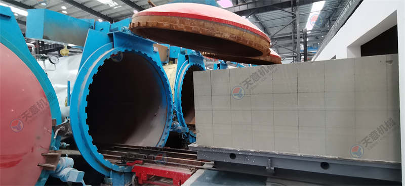 蒸壓養(yǎng)護(hù)是對(duì)加氣混凝土坯體進(jìn)行高壓蒸汽養(yǎng)護(hù),對(duì)加氣混凝土而言,只有經(jīng)過一定的溫度和足夠時(shí)間的養(yǎng)護(hù),坯體才能完成必要的物理化學(xué)變化,從而達(dá)到滿足建筑施工的強(qiáng)度需要。 蒸壓養(yǎng)護(hù)工序決定了加氣混凝土內(nèi)在性能的最后形成。 裝入蒸養(yǎng)釜: 養(yǎng)護(hù)車上坯體被運(yùn)至蒸養(yǎng)釜, 在釜中受到高壓蒸汽的養(yǎng)護(hù)