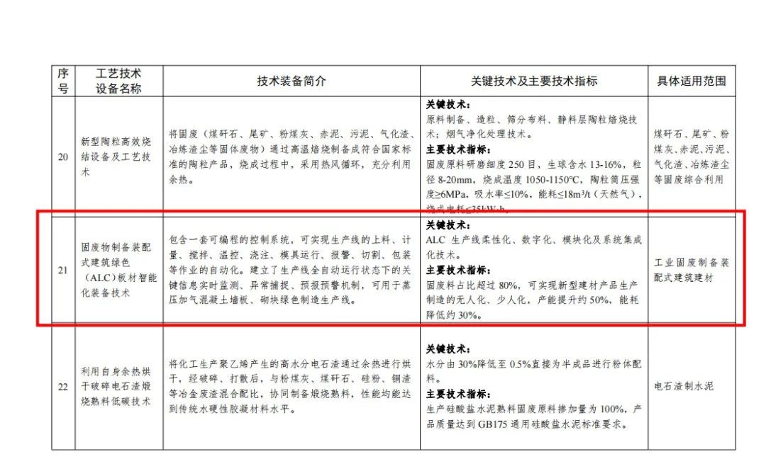天意機(jī)械主導(dǎo)產(chǎn)品包括輕質(zhì)墻板智能裝備、PC智能裝備、蒸壓加氣混凝土(ALC)板材智能裝備、保溫裝飾一體化板智能裝備等系列。設(shè)備均以固廢物利用為研發(fā)條件,不斷進(jìn)行設(shè)備及配方的更新。此次入選目錄的是ALC板材智能裝備,該設(shè)備關(guān)鍵技術(shù)涉及ALC生產(chǎn)線柔性化、數(shù)字化、模塊化及系統(tǒng)集成化技術(shù)。該生產(chǎn)線固廢料占比超過(guò)80%,可實(shí)現(xiàn)新型建材產(chǎn)品生產(chǎn)制造的無(wú)人化、少人化,產(chǎn)能提升約50%,能耗降低約30%。