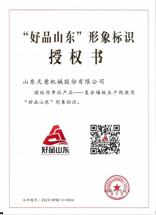 9月12日,由山東省市場(chǎng)監(jiān)管局會(huì)同省委宣傳部、省發(fā)展改革委、淄博市政府共同主辦的山東省2023年“質(zhì)量月”啟動(dòng)儀式在淄博舉行。活動(dòng)發(fā)布第二批“好品山東”品牌遴選名單,共計(jì)105個(gè)品牌,天意機(jī)械憑借復(fù)合墻板生產(chǎn)線入選“好品山東”品牌遴選名單。