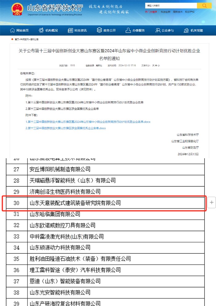 日前,山東省科技廳會(huì)同有關(guān)單位共同組織實(shí)施了第十三屆中國創(chuàng)新創(chuàng)業(yè)大賽山東賽區(qū)暨2024年“建行創(chuàng)業(yè)者港灣”山東省中小微企業(yè)創(chuàng)新競技行動(dòng)計(jì)劃,山東天意裝配式建筑裝備研究院有限公司成功入選優(yōu)勝企業(yè)。