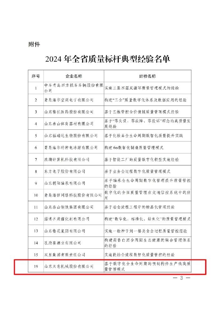 7月,山東省工業(yè)和信息化廳公布了全省質(zhì)量標(biāo)桿獎(jiǎng)。天意機(jī)械憑借在關(guān)鍵過(guò)程質(zhì)量控制方向的不懈探索,以基于數(shù)字化全生命周期的預(yù)制構(gòu)件生產(chǎn)線高質(zhì)量管理模式斬獲“2024年全省質(zhì)量標(biāo)桿”。