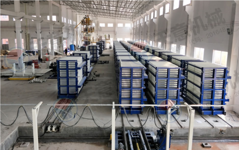 該復(fù)合墻板生產(chǎn)線采用立式旋轉(zhuǎn)臥式出板復(fù)合墻板成型機(jī),一次可生產(chǎn)四十塊墻板,該生產(chǎn)線主要分為:配料攪拌系統(tǒng)、墻板成型系統(tǒng)、液壓整體開模系統(tǒng)、液壓翻轉(zhuǎn)系統(tǒng)、整體出板翻轉(zhuǎn)碼垛系統(tǒng)、成型機(jī)自動(dòng)循環(huán)系統(tǒng)、變頻擺渡系統(tǒng)、數(shù)控配電系統(tǒng)等部件 組成。該生產(chǎn)線自動(dòng)化程度高,液壓開合模,解決了傳統(tǒng)立式復(fù)合墻板機(jī)人工開合安全隱患,提高了工作效率。設(shè)備配有整體出板碼垛系統(tǒng),解決了傳統(tǒng)人工出板方式,減少產(chǎn)品的破損率,提高了產(chǎn)能。生產(chǎn)線使用密封式泵送系統(tǒng)配備雙工位注漿槍,注漿速度快密實(shí)度高,材料粘結(jié)更緊密。